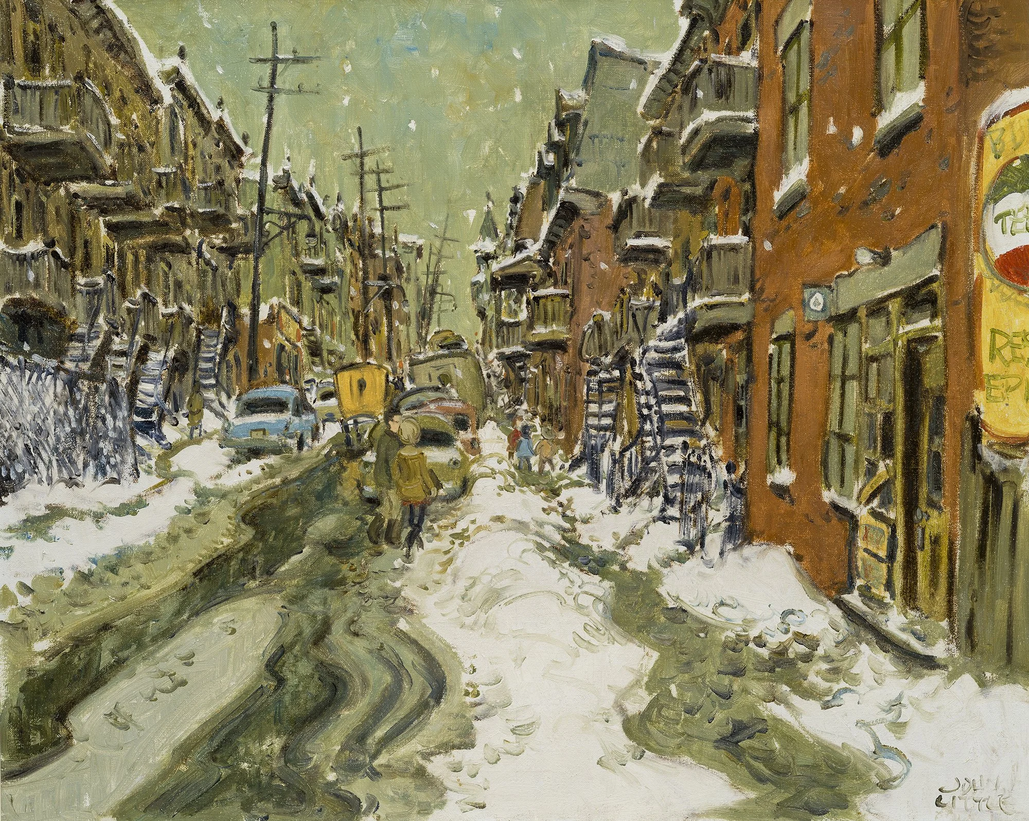 In this large scale but intimate winter scene, John Little turns the viewers attention toward the architecture and atmosphere of everyday life. The steep iron staircases, narrow façades, and snow-covered street embody the rhythm of the city’s older boroughs. Figures, adults and children alike, move along the slushy roads and sidewalks. Shop windows, a depanneur and delivery trucks hint at a sense of life within the neighbourhood.